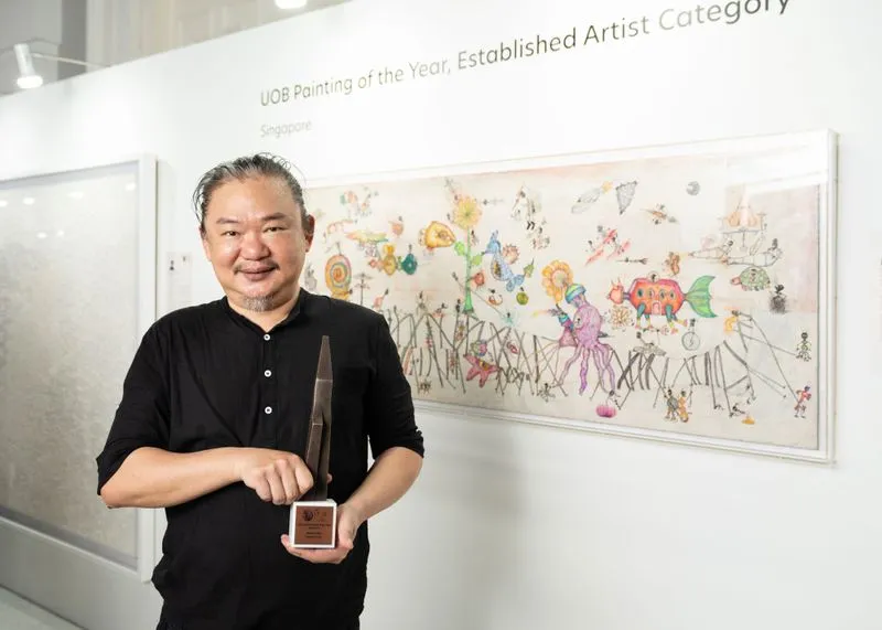 Interdisciplinary artist, curator and BA (Hons) Fine Arts alumnus Jeremy Hiah's mixed media work Gulliver's Travels won the prestigious 42nd UOB Painting of the Year Award (Established Artist Category, Singapore), while Om Mee Ai, MA Fine Arts alumna, took home the Bronze Award in the same category for her painting R152-QUF.